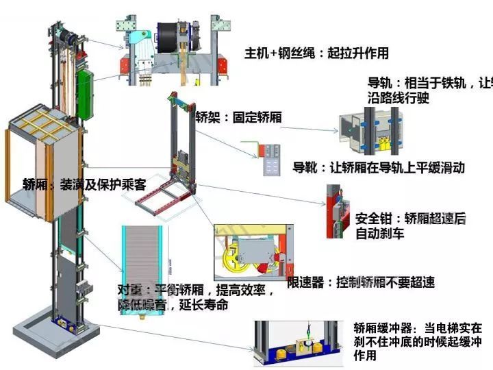 这是得到欧标和国标双认可的真正的电梯,曳引是牵引的意思,曳引电梯是靠对重牵引着轿厢做往返运动,而电机只出一点点力量,类似于动滑轮原理。十多年前发明了永磁同步主机以后造就了无机房电梯,到现在无机房电梯产品越来越成熟,现在低层的建筑及家用如果要安装客用电梯基本都在采用无机房曳引电梯,无机房曳引电梯机械结构图: