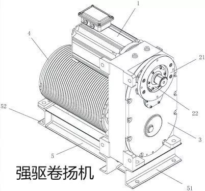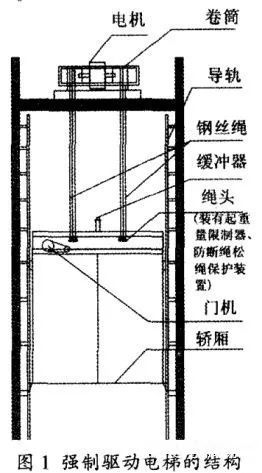 强驱曳引式电梯的强驱运行原理是用一个固定在井道一端的卷扬机将轿厢吊起,专业术语上称为强制驱动电梯。强制驱动目前仍然用于各大建筑工地的卷扬机上,由于缺点比较明显,一般不用于正常的建筑内电梯。
